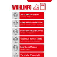 In den kommenden Wochen laden wir herzlich zu unseren Wahlinfo-Veranstaltungen in allen Gemeindeteilen ein. Dort stellen wir unseren Bürgermeisterkandidaten, unsere Kandidatinnen und Kandidaten für den Gemeinderat sowie unsere Themen für Meeder vor.